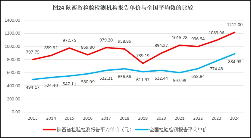 由图24可见,12年来,陕西省检验检测报告的单价总体保持增长,且一直比全国平均数要高。2024年,陕西省检验检测报告平均单价1212.00元,比全国平均数高了327元。可见,陕西省检验检测机构虽然对外出具的检验检测报告数量不大,但其报告单价较高,因此检验检测机构能够确保合理的利润,这就为检验检测行业健康发展奠定了基础。