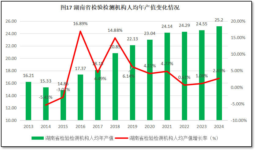 人均年产值是衡量检验检测机构经营运行质量的直观指标。2024年度,湖南省检验检测机构人均年产值25.2万元,离30万元行业温饱线和2024年度全国31.45万元的人均产值平均值还有一定距离,排名居于全国第13位(由高到低排序),较2023年度排名下降1位。这表明湖南地区检验检测机构经营状况一般,劳动生产率不高,机构利润空间有限。过去12年湖南省检验检测机构人均年产值的变化情况,如图17所示。