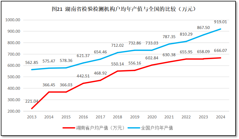 由图20可见,总体来看,湖南省检验检测机构户均年产值持续保持增长,仅在2015年出现过一次轻微下跌。2024年湖南省检验检测机构户均年产值为666.1万元,是2013年的3.01倍。从增长率的曲线来看,除了头两年数据误差大显得增长率很高之外,湖南省检验检测机构户均年产值的同比增幅总体平稳,近11年的平均增长率为6.37%,在2016年和2018年出现过两次相对高一些的增长峰值,增幅分别为20.89%和17.32%。最近几年增幅逐步降低,2024年的同比增幅仅有1.21%。